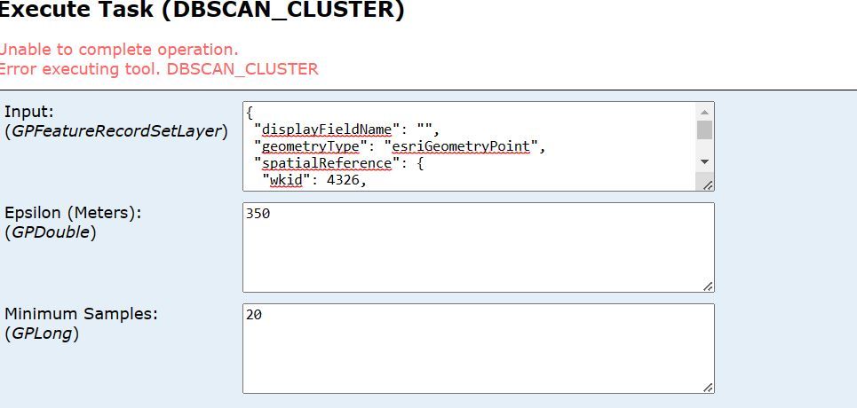 import arcpyimport pandas as pdfrom math import radians, cos, sin, asin, sqrtfrom sklearn.cluster import DBSCANfrom scipy.spatial.distance import pdist, squareformimport matplotlib.pyplot as pltimport numpy as npif __name__ == "__main__":arcpy.env.overwriteOutput = Truein_file = arcpy.GetParameterAsText(0)output = arcpy.GetParameterAsText(1)epsilon = float(arcpy.GetParameterAsText(2))min_sample = int(arcpy.GetParameterAsText(3))#Convert the feature class to a pandas DataFramearray = arcpy.da.FeatureClassToNumPyArray(in_file, ["SHAPE@X", "SHAPE@Y"])df = pd.DataFrame(array)#Extract the X and Y coordinates from the DataFramecoords = df[["SHAPE@X", "SHAPE@Y"]].values#Get the spatial reference of the input feature classdescribe = arcpy.Describe(in_file)#create spatial objectSR = describe.spatialReference#Create a spatial reference objectSR = arcpy.SpatialReference(SR.FactoryCode)def haversine(lonlat1, lonlat20) :# convert decimal degrees to radianslat1, lon1 = lonlat1lat2, lon2 = lonlat2lon1, lat1, lon2, lat2 = map(radians, [lon1, lat1, lon2, lat2])# haversine formuladlon = lon2 - lon1dlat = lat2 - lat1a = sin(dlat/2)**2 + cos(lat1) * cos(lat2) * sin(dlon/2)**2b = 2 * asin(sqrt(a))r = 6371 # Radius of earth in kilometers. Use 3956 for milesreturn (b * r) * 1000distance_meter = squareform(pdist(coords, (lambda u,v: haversine(u,v))))arcpy.AddMessage(epsilon)arcpy.AddMessage(min_sample)#Function DBSCANdb = DBSCAN(eps=epsilon, min_samples=min_sample, metric='precomputed').fit(distance_meter)y_db = db.fit_predict(distance_meter)#visualization of db_scanplt.scatter(distance_meter[:,0],distance_meter[:,1],c= db.labels_)plt.xlabel("X")plt.ylabel("Y")plt.title("Grafik Data compound DBscan")plt.showprint("Jumlah Kluster:{}".format(len(set(db.labels_[np.where(db.labels_!=-1)]))))print(db.labels_)labels = db.labels_#Export feature classarcpy.env.overwriteOutput = Trueout = arcpy.da.NumPyArrayToFeatureClass(array, output, ["SHAPE@X", "SHAPE@Y"],spatial_reference=SR)#Add field cluster into feature class outputcluster = arcpy.AddField_management(output,"CLUSTER","Short")with arcpy.da.UpdateCursor(output,["CLUSTER"]) as cusor:for i, row in enumerate(cusor) :row[0] = labels[i]cusor.updateRow (row)