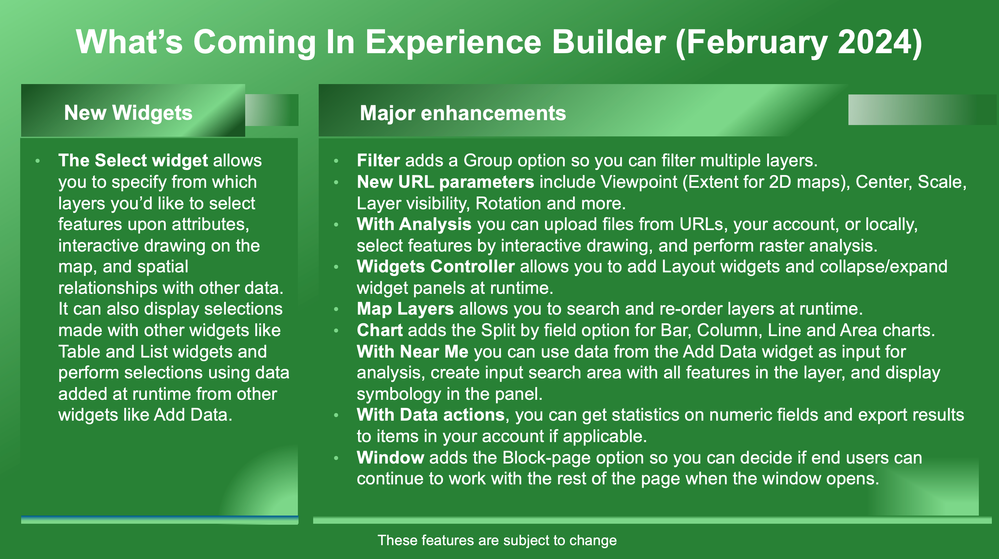 A glance of upcoming new features in Experience Builder in ArcGIS Online February release late this week. More capabilities are migrated from Web AppBuilder to Experience Builder.