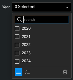 Currently, the buttons at the bottom of this dropdown menu are for 'Show all', 'Show selection', and 'Clear selection'. I propose either adding a Select/Deselect All button to these existing buttons or adding an 'All' checkbox at the top in a similar fashion as the button for the Search widget when you configure it with multiple search sources.