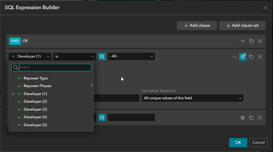 So I want to make a query or filter widget in experience builder that has one query for multiple different attributes. For example in my data certain projects have multiple developers. IE: Developer (1) to Developer (5):