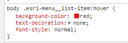 What I'd do is to inspect the dom and then target the element you want to adjust, in your case I believe that's the .esri-menu__list-item ---- just add the below css into your style.scss and you should be good. Not sure if that's the ideal or best way, but it should work.