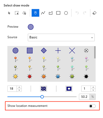 There is an option called Enable measurement in the draw widget settings. This option controls the display of measurement toggles in the draw widget. By default, it is disabled, which means that newly added widgets will not show the related options. Once you enable this option, the measurement options will become visible.