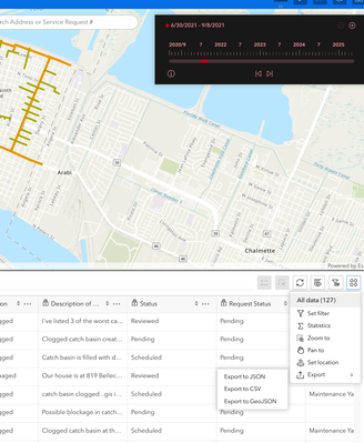 I've setup a timeslider widget for drainage service requests. The timeslider works perfectly and filters the requests to a range of two dates. The filtered requests show in the table, however, any attempt to export this filtered set to csv results in the entire data set being exported.