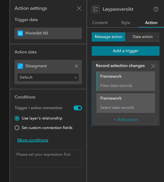 When I select a row in List1 (Main tracks), I filter and select all common rows in the relationtable. This relation-table has action to filter and select track segments in the line feature service in the map. The result should be filtered and selected track segments in the map.