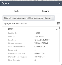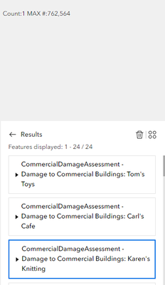 - Add a Text widget > connect it with the Query output data source, and use the "Selected features" view [if you want to see statistics for each result item]; use the "Default" view if you want to see statistics for all results without any selection needed