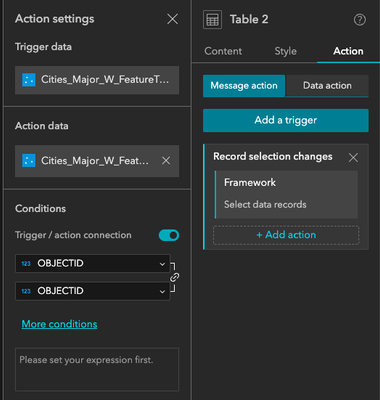 • Configure a Record selection changes action from the widget you would like to interact with (I used a table as an example), target the framework and choose this field-customized view layer as target dataScreenshot 2023-04-12 at 16.40.51.png