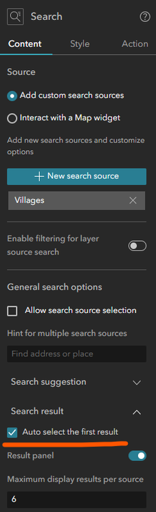For example, I've set up a search widget to search a "villages" layer (default data view). In the search result area, I've selected "Auto select the first result." This last part isn't absolutely necessary, it just makes selecting take a click less or so.