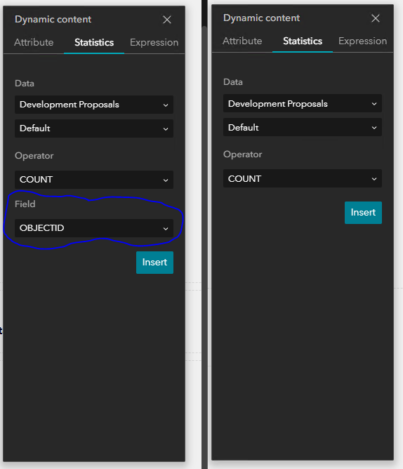 When previously using the COUNT function, there was no 'Field' dropdown and simply using COUNT() would give you the total record count. Now I am trying to use COUNT({OBJECTID}) and it works until I set the map action to filter the data by map extent.
