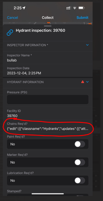 Currently in ArcPad, this all automated through a script when they hit the "Save" button at the end of the inspection.  So ideally with Field Maps, once they hit the "Submit" button after they fill out the entire inspection form, is where this business logic would happen to determine how to update the INSP_STATUS field on the hydrant.  For now, I am just trying to get it to work with the one field CHAINS, but in reality I would need to look at about 10 different fields before I determine whether to set it to WR or to YES.