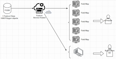 I feel that the supervisors can access the FGDB directly, but they can't do so because the FGDB is hosted. Or maybe the surveyors can take offline data to the field and synch the latter to the server, like this one:https://www.esri.com/arcgis-blog/products/field-maps/field-mobility/work-offline-with-field-maps/