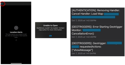 The map areas include an online version and several offline maps due to many of our users being in remote locations. While the offline maps are working, it is now impossible to open the online map. Choosing the online map brings you to the screen asking the enable Location Alerts, which spins indefinitely. Then backing out prompts an "Unable to Open" message stating that geofences could not be loaded. Below is also a snippet from the logs.