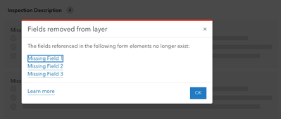 Hello @Anonymous User - I am having a similar issue to those in this thread where I am getting the error message "The form contains unsupported data". For this map, I created a feature called ARV_Inspections that I would like to be able to fill in using the form from the Field Maps mobile application. I went into the troubleshooting on the app and saw the note "ARV_Inspections: Info references fields that are missing in the table: ["struc_dia", "arv_count"]. These used to be fields in my layer, however, I deleted them and replaced them with fields of different names (struc_dims and arv_num). I also went through the form and I am not seeing a reference to the old fields.