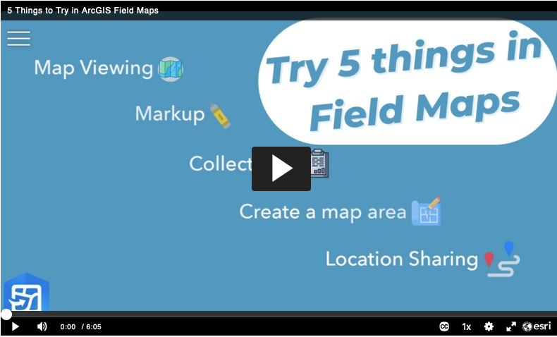 ArcGIS Field Maps combines map viewing, data collection and location sharing into a single app for easier and more efficient mobile work. Watch this video to learn about five things you can try to get started with Field Maps.