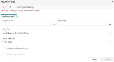 ArcGIS for Excel has formulas that you maybe familiar with in Microsoft Excel. With these formulas you can use to geocode, geoenrich, and perform route operations. Each function starts with the equal sign in a cell followed by the function name and the cell range it applies to. Once you get acclimated to all these functions, you can easily access them from the Function Builder tool on the ArcGIS for Excel toolbar.