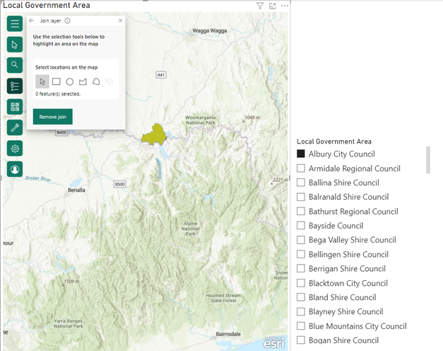 When using the slicer to select an LGA area, the deliberately coloured outline of select LGA boundaries remains (which is what I want) however the greyed out areas disappear.