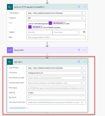 Using the “Get” method in the “Send an HTTP request to SharePoint”, we can retrieve all the terms currently stored in the SharePoint org’s term store.