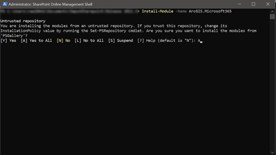 The next step is to install the ArcGIS.Microsoft365 module. Run the following cmdlet to install the module.