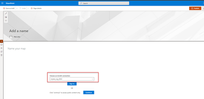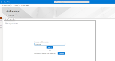 Once signed-in and the connection to Graph API is established, the tenant administrator can now configure a list of ArcGIS connections for the map authors within the organization. Once the list of ArcGIS connections is configured, members within the organization can pick the ArcGIS connection from the drop-down, which is now part of the new sign-in experience in ArcGIS for SharePoint.
