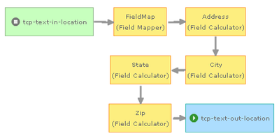Wrapping each of the equations above into a Field Calculator for each field requires four nodes, as illustrated in the GeoEvent Service below. In addition, a Field Mapper is necessary to convert the event to a GeoEvent Definition that includes all the new fields: Address, City, State, and Zip. This is done so each Field Calculator can write derivative values into existing fields rather than each Field Calculator creating a new GeoEvent Definition as new fields are created.