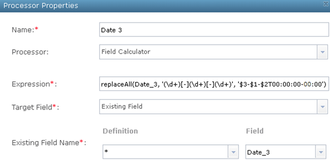 The data provider has used the ISO 8601 formatting standard to express Date_1 attribute values. GeoEvent Server adapters and/or processors can easily cast an ISO 8601 formatted string to a date out-of-the-box. An expression simply names the string field whose value should be written to a date attribute field. No additional calculations are necessary for this value. Refer to the illustrations in the Incorporate date string calculations in a Field Calculator section below.