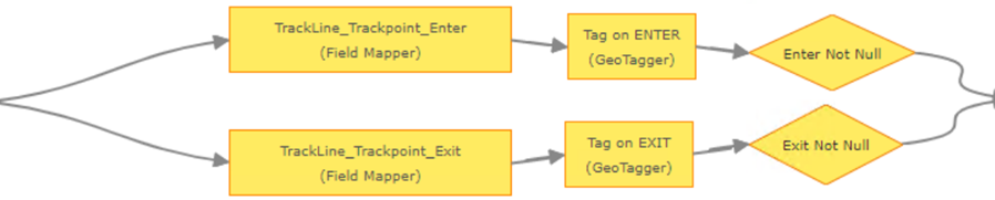 The real weirdness starts when you run the same eight track points through the GeoEvent Service. This time the “Enter” branch at the top seems able to determine that the event is entering something but cannot name the geofence being entered.