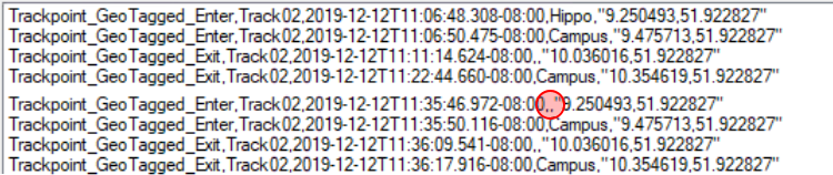 The weirdness starts when the track point is first observed exiting the geofence “Hippo”. The GeoTagger output has a null value in the geofence’s name, even though the Filter determined that an exit has occurred. Why? Because the “Tag on Exit” GeoTagger never saw an event record inside “Hippo” and the global setting “First Event Triggers Exit” default to False.