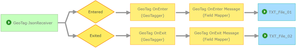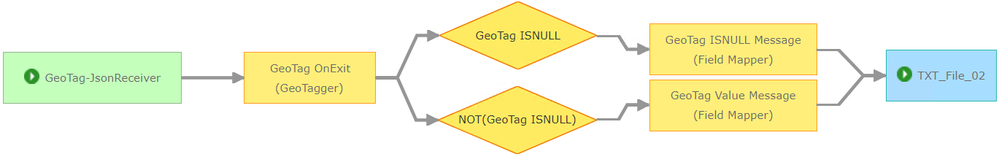 Illustrated above I have placed two mutually exclusive attribute filters after the GeoTagger processor. The first filter catches the condition when the processor does not recognize an exiting condition and therefore does not write the name of a geofence into an attribute field named GeoTag. Presumably I want to craft some specific message in this case, so I route the event record through a Field Mapper which places a simple message (as a String) into a field to indicate that the current event record has not exited an area of interest.