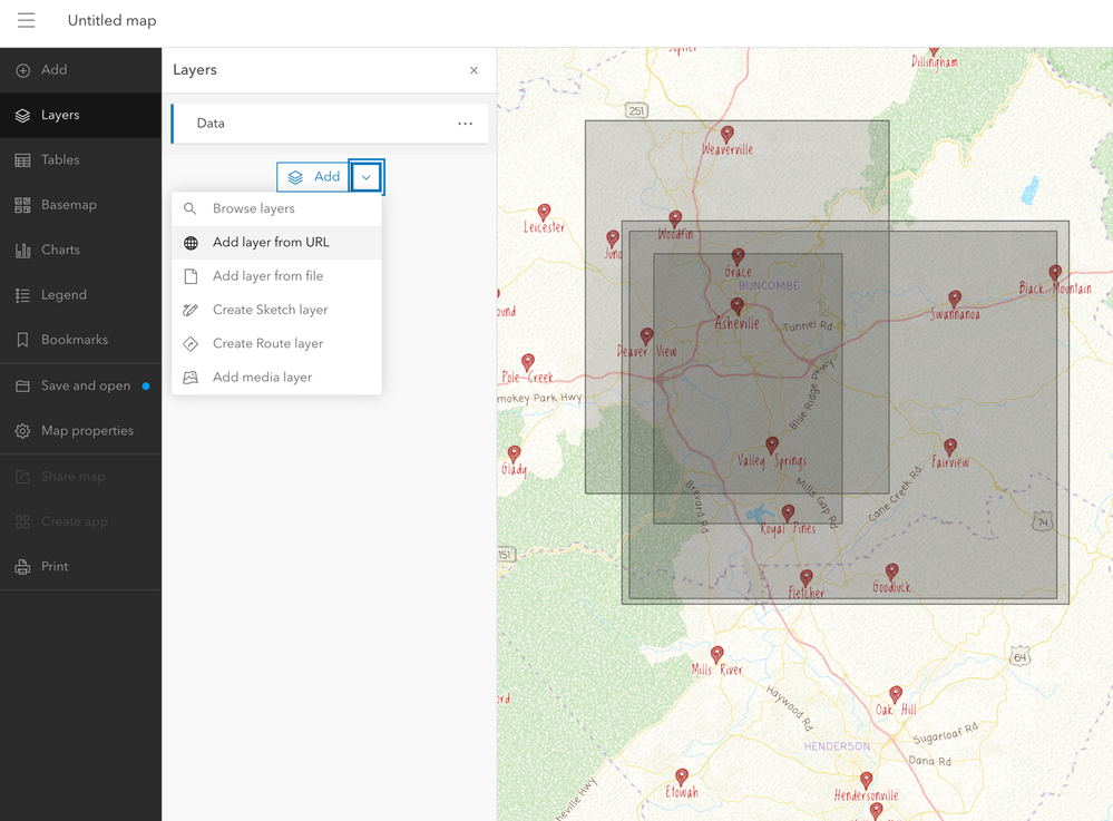 Above is a screenshot of an ArcGIS Online web map with a layer added from the “Data” collection of a Hub site about Asheville, NC, USA. To add data using Hub site’s OGC API – Records API, select the dropdown next to “Add”, and select “Add layer from URL”.
