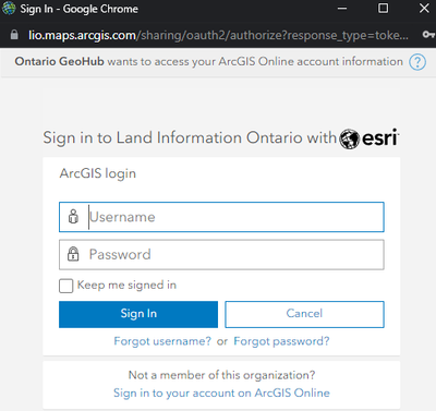 If a user tries to sign in to our Ontario GeoHub site, the sign-in window that pops up defaults to the AGOL organization that the Hub site is hosted from: