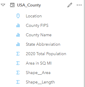 @Ian_Muehlenhaus, for enabling location I am using the `US Census 2020` data from the Living Atlas. In this dataset, the data of interest is US County which has multiple columns as shown below: