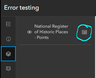 I recreated error using a living atlas layer Historic Places.   Making a simple map and with Show Table in the Sidebar.