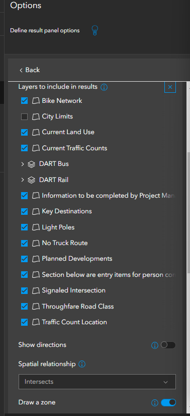 I have everything configured in the map and the app, and I am not getting the expected results when I use the line tool and a 1/4 mile buffer.  I've chosen "Feature Within a Zone" and the spatial relationship is "Intersects" all of the following: