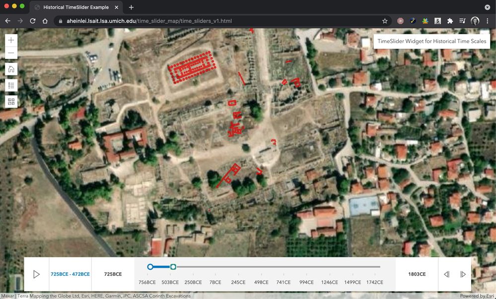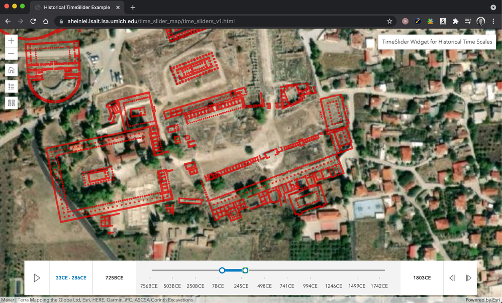 You can see an example of this customized TimeSlider in action here. This is a map of structures in the city of Corinth across a wide range of years, extracted from an archaeological dataset from the ASCSA Corinth Excavations available in ArcGIS Online. You can read more about their work and this dataset on their website. I chose this data mainly for its range of dates, which scales the range from about 750 BCE to 1800 CE, a range that wouldn't normally be possible to scroll with a TimeSlider widget.