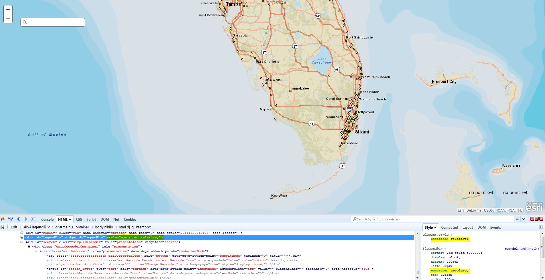 The legend div, which was previously in a border container, I would now like to position over the map. Despite a number of different attempts, including adding position information to the .esriLegendLayer and .esriLegendService to both an external and internal style sheet, I was able to alter the properties of the box but not move it.