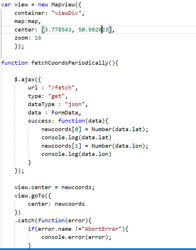 I start by building the map and center it around an initial coordinate pair. Immediately after that I launch a periodical GET request (intervals of 200ms) to a server who responds with updated coordinate pairs, which I then assign to mapview.center . When I console.log(view.center) I can see the values in the center object changing over time. So far , everything seems to be working as intended. But the mapview does not change. It stays centered around the initial pair of coordinates and , curious thing, when I manually drag the mapview to another location, one that movement is finished, the mapview jumps back to the initial coordinates. can someone point out to me what I am misunderstanding about how to approach this?