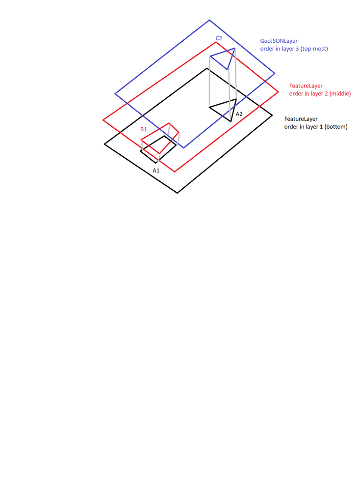 Hi, I am working in 2d mapview and encounter a problem ordering shapes. In the picture, you can see I have the middle layer sandwiched between two others. According to the natural ordering of layers, the middle layer's shapes will be drawn on top of the bottom-most layer, but underneath the topmost layer. However in the picture, I'm trying to get the shape A2 to appear above C2, while keeping the shape A1 below B1. Is it possible?
