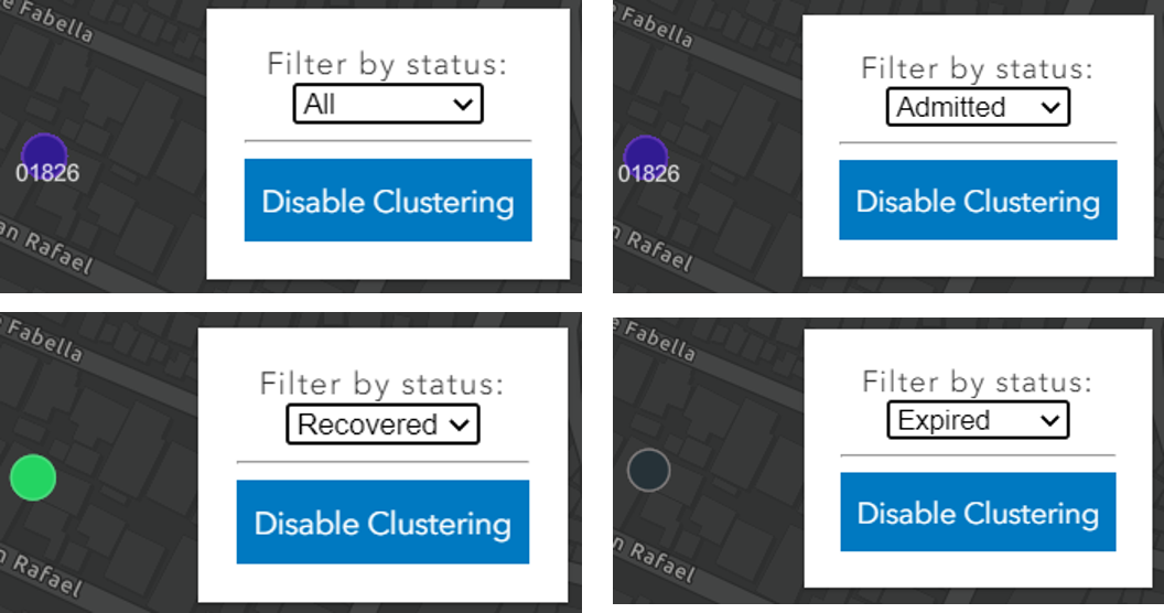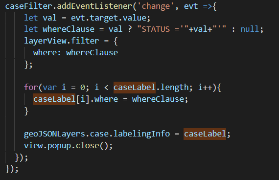 I'm working with 4.14 version of JavaScript API, but apparently, LabelClass is not working as expected. I have a widget that filters out features from a layer based on its status. In the illustration, I have overlapping points. Filtering works. However, labels for filtered features are not showing.