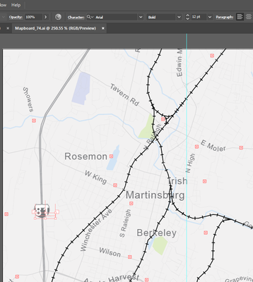 However, when loading the basemap in to a mapboard when syncing to ArcGIS Maps for Adobe Creative Cloud, the font of Arial Bold loads, but the point size always renders at 12 pt (regardless of selected scale) and obviously dwarfs the symbol graphic.