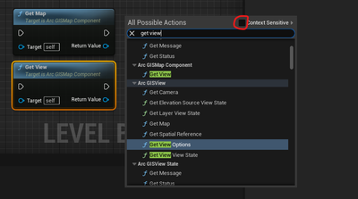If you can't find a specific Blueprint node/function, you can try to uncheck the "Context Sensitive" option in the Context Menu. You should now be able to find the "Get View" node for example: