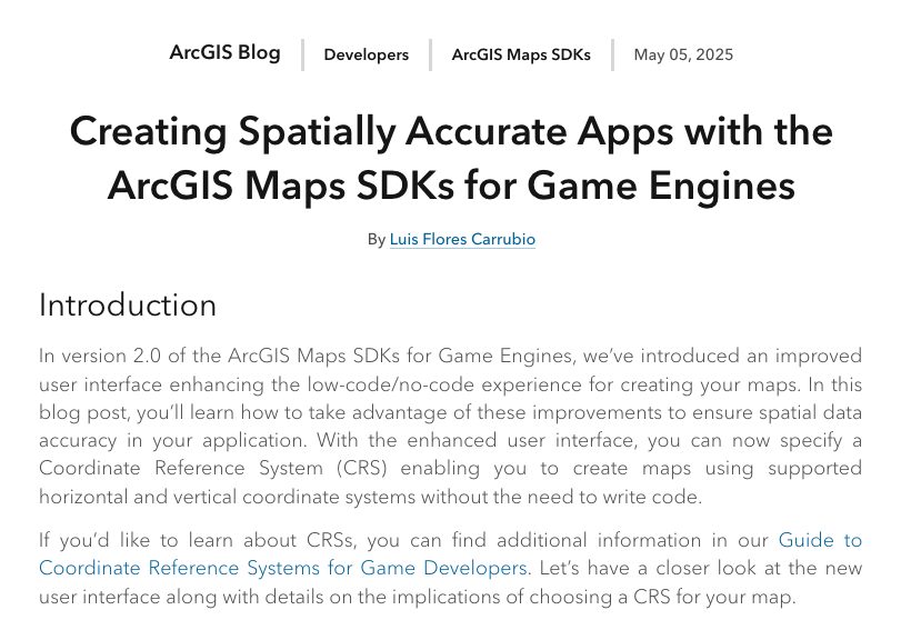 In this new game engine developer's blog post (find it here on the ArcGIS Blog), learn how to specify a Coordinate Reference System to create maps using supported horizontal and vertical coordinate systems without the need to write code.