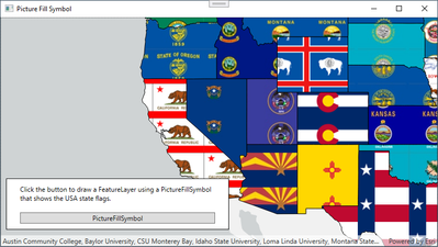 TextBlockInstructions.Text = "Click the button to draw a FeatureLayer using a PictureFillSymbol that shows the USA state flags.";