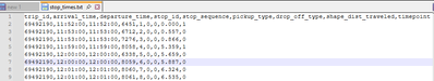 Which are all clean, and formatted correctly. The stop_times.txt file format specifically looks like this:
