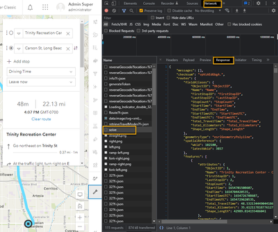 Yeah, this is a warning message from the solve request, which just means some fields from your inputs cannot be mapped to our internal analysis class, nothing to worry about here. I don't expect this to cause the "Unable to route to between stops" message you see on the directions widget. Looking at your full error text file, I think the one you sent over is a successful solve with some warning messages, a failed solve will have a json like this: