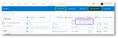 We added this enhancement with the November 2024 release of ArcGIS Online. Organization members can enable/disable delete protection for multiple items from My content tab. Administrators can also see the option from My organization's content.