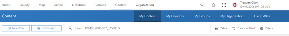 Screenshot of the ArcGIS Online banner showing Content>My Content