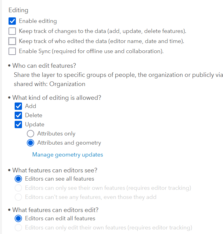 So if I'm understanding this correctly, "Editors can only see their own features (requires editor tracking)" should be checked off? And "Enable editing" should be turned back off? I have tried this and it's not working for me still.