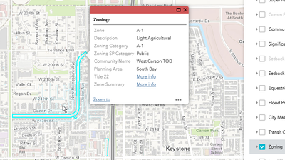 I also notice some oddities in the zoning polygons in the area bounded by S Vermont, W 214, W Carson, and I-110. The online map is highlighting different zoning polygons than what shows. You can see an A-1 polygon in the top image that doesn't appear in Pro