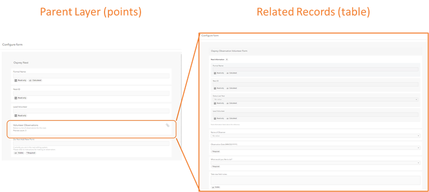 When trying to set up a Map Viewer Form with related tables, 'referenced' feature services with related tables do not show up under the form's available layers when it's in the map, whereas 'hosted' related tables do show up. Below is an example for a hosted service, what we should be seeing for referenced services as well but are not: