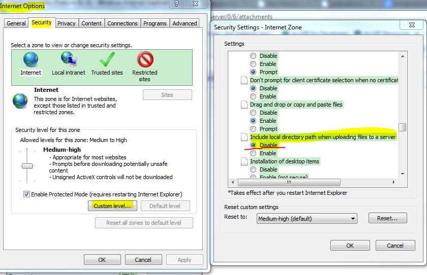 1. Open Internet Explore and click Tools --> Internet Options --> Security --> Custom level button