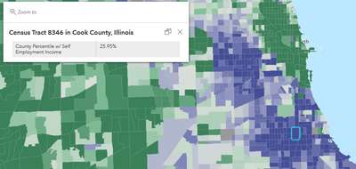 This should be straightforward enough but does depend on the input data. I'll use an ACS household income layer in my example. In particular, I'm going to get the percentile rank of a given census tract based on the attribute B19053_002E, which is the number of households reporting self-employment income.